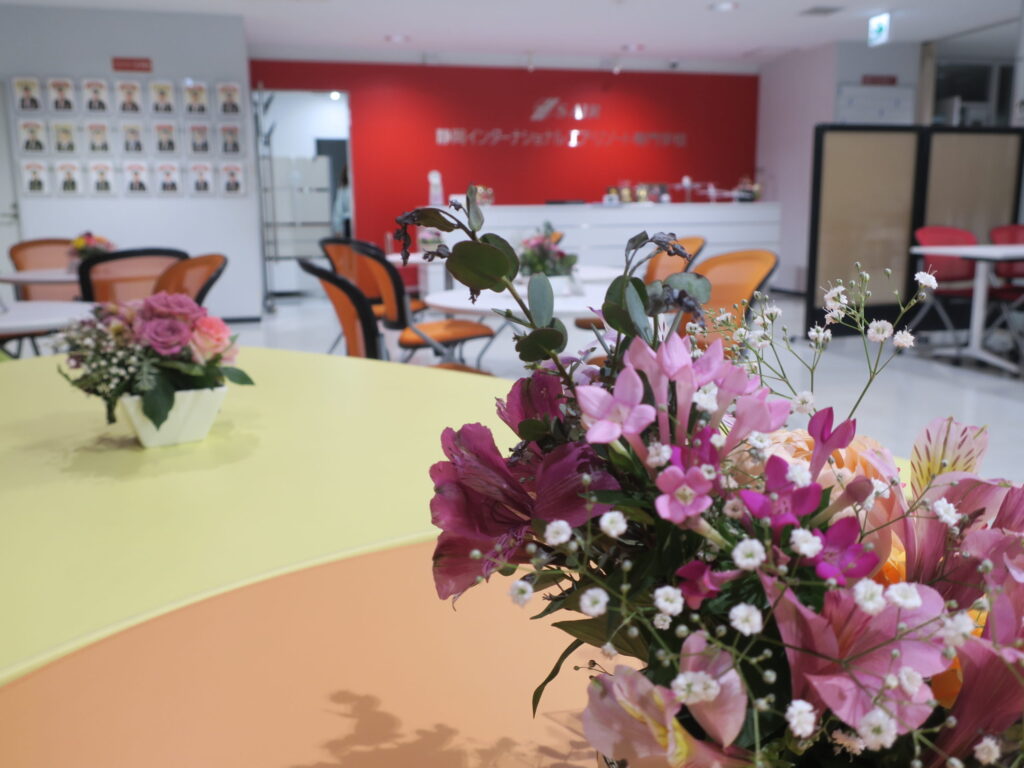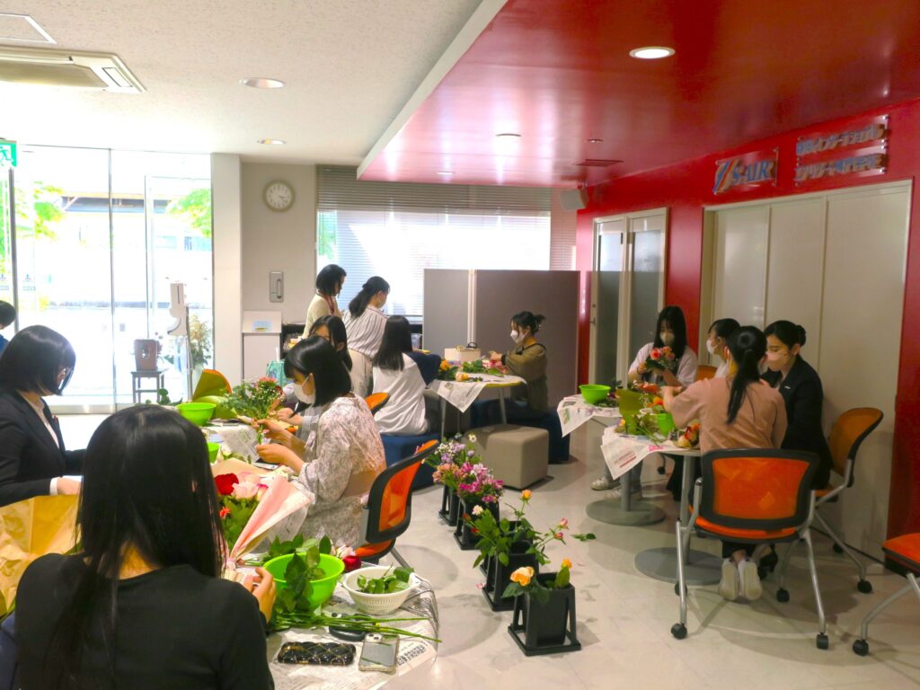 心を込めた華道作品は、学校正面入り口のロビーや受付、階段の踊り場など学校内の至るところに飾られ、学校を訪れる方を表情豊かにお迎えしています。ご来校の際にはぜひ、S-AIRを明るく彩る学生の作品を是非ご覧くださいね♪